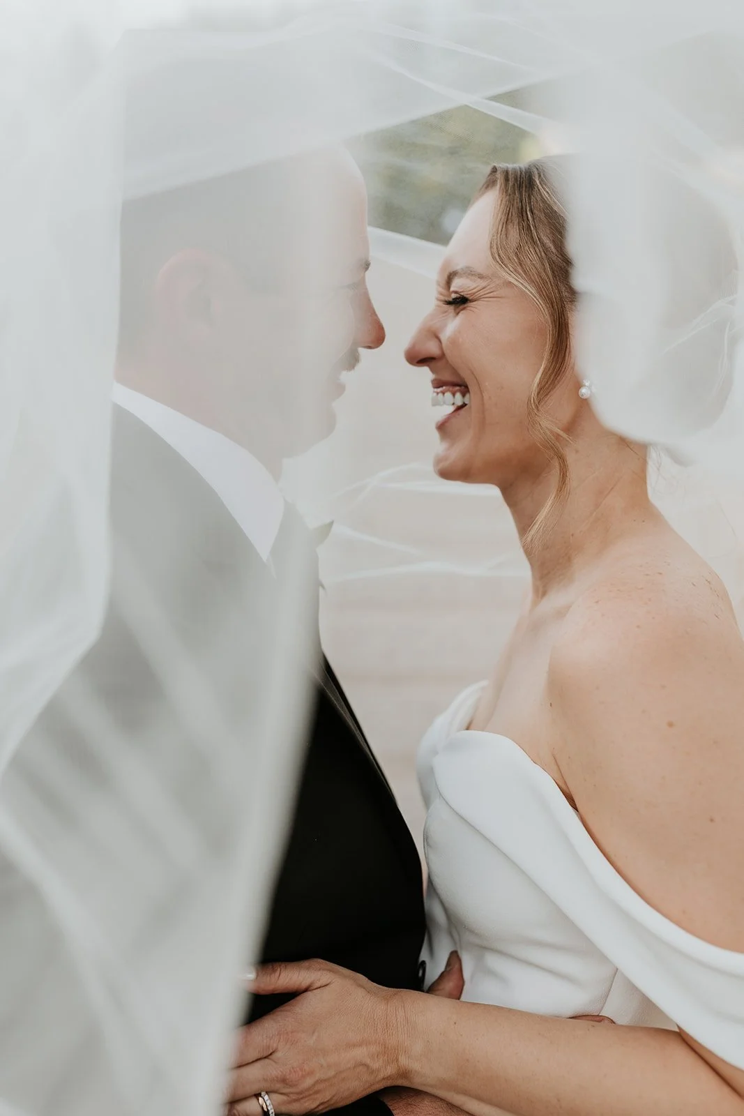 A bride and groom smiling and about to kiss, with their faces close together, seen through a sheer veil.