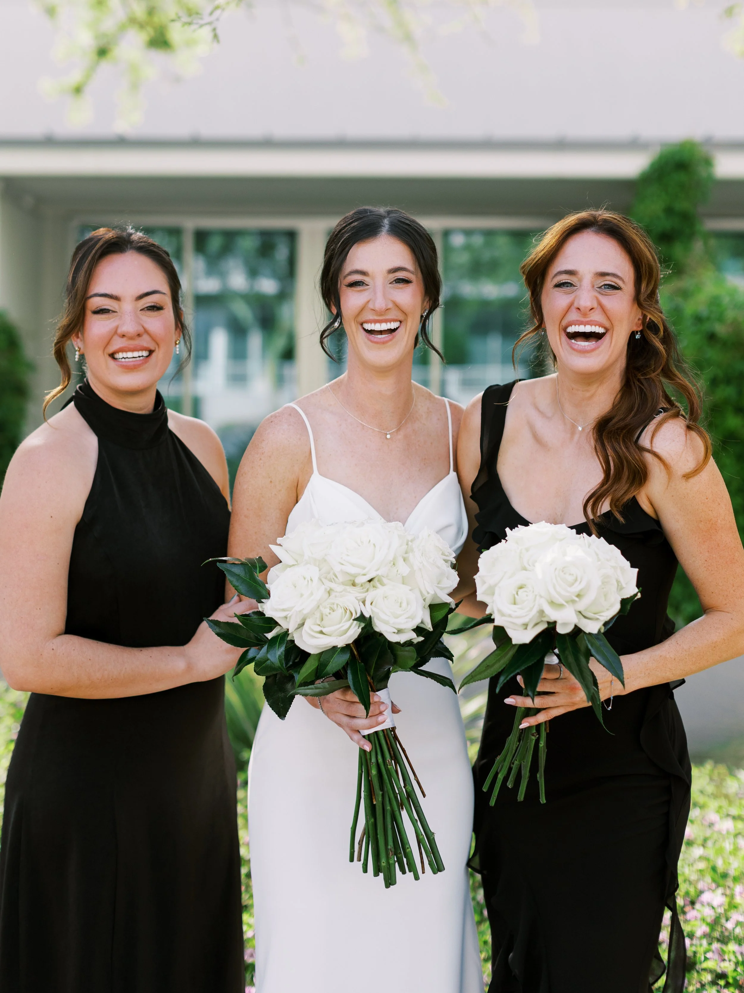 Three women, one in a white wedding dress holding a bouquet of white roses, and two in black dresses holding similar bouquets, smiling and standing outdoors in front of a house with greenery.