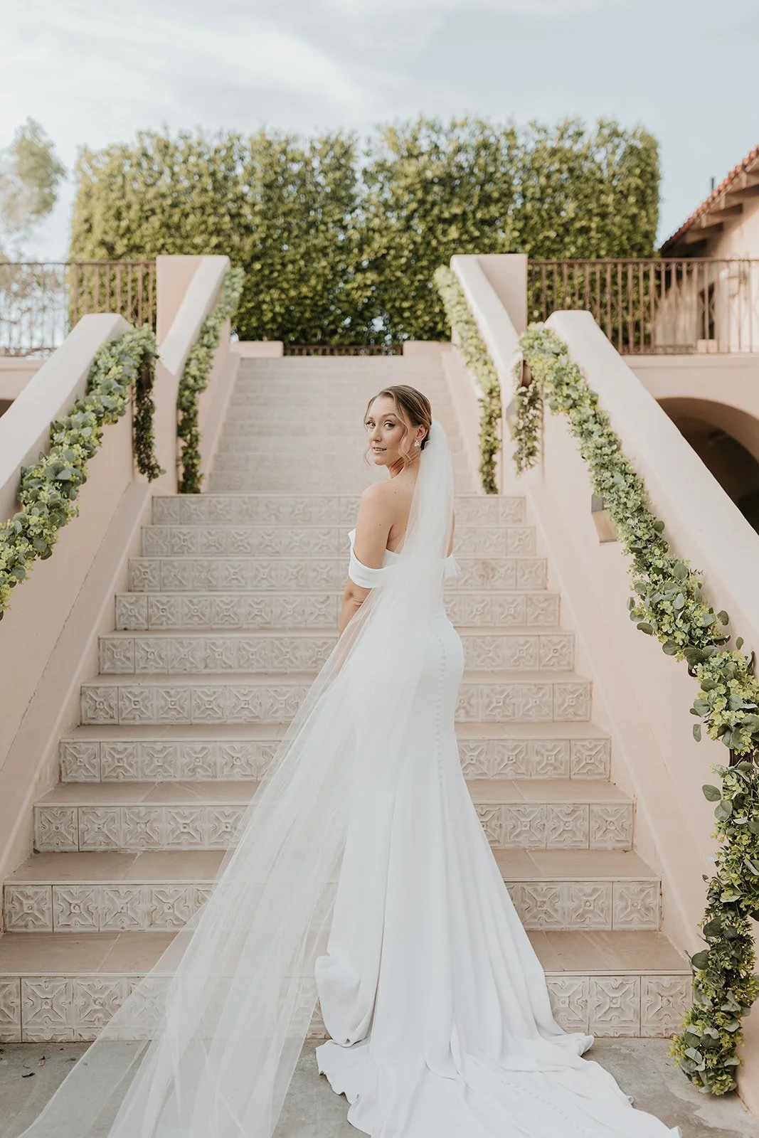 Bride in a white wedding dress with a long veil standing on outdoor stairs decorated with greenery and white flowers, looking back at the camera.