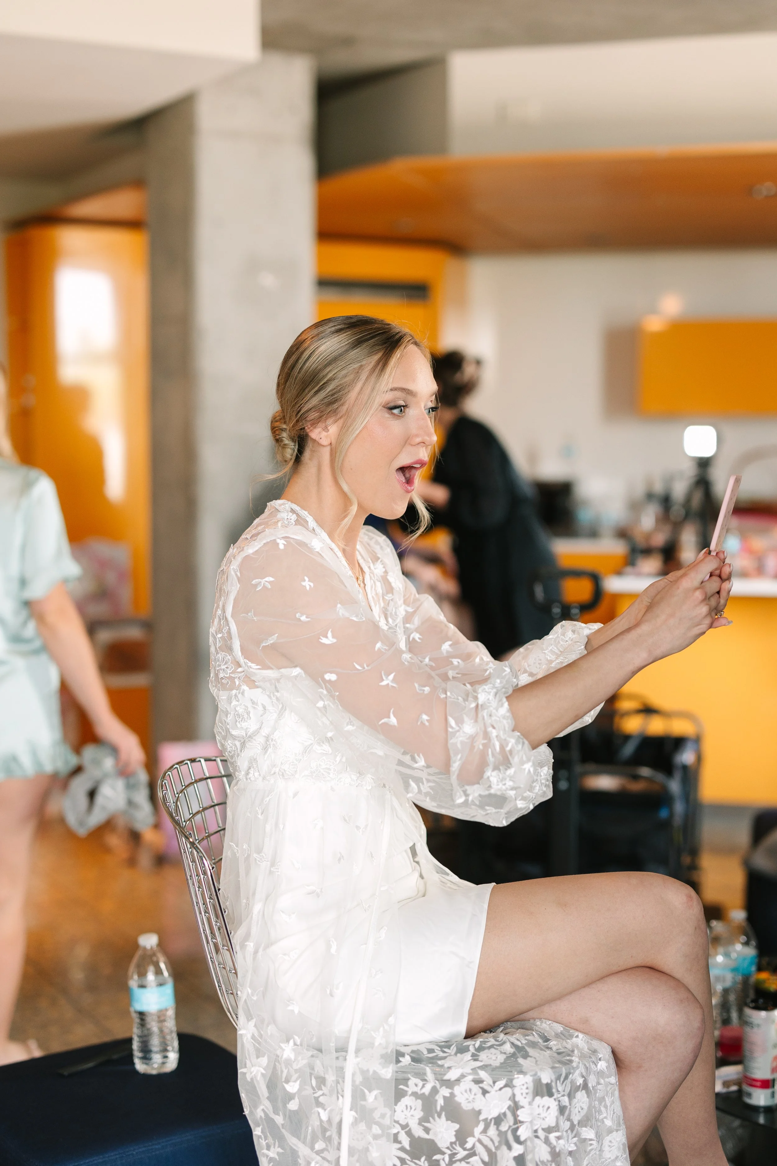 A woman in a white lace dress with embroidered flowers sitting on a chair, looking at her phone with an surprised or excited expression, in a brightly lit room with orange cabinets in the background.